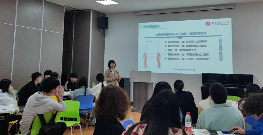讲座开始,呼永力以《一“搜”就会——就业信息收集与管理》为主题,为学生讲解了如何进行就业信息的收集与分析,引导学生了解自己的优势,积极求职。随后,杨红娟以《一“简”钟情——简历优化实验室》为主题,告诉学生如何制作出一份要素齐全、重点突出并能展现个人特点的简历。最后,苏瑾以《一“面”倾心——面试提升训练》为主题,从面试的类型、流程、技巧、礼仪等方面进行了详细的讲解。