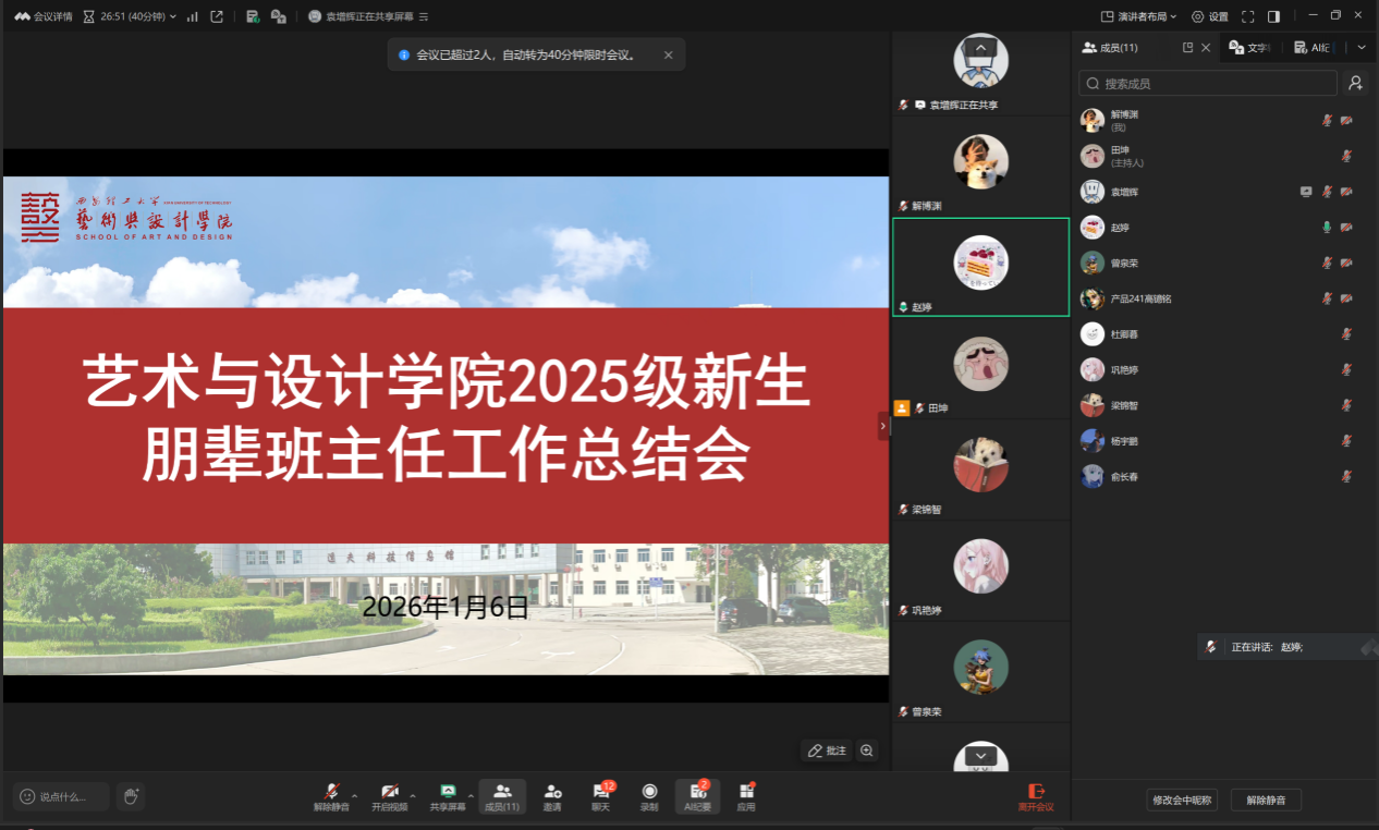 为提升学院新生教育管理服务质量,构建“传帮带”育人体系,1月6日,伟德bevictor中文版以线上形式召开2025级新生朋辈班主任工作总结会。会议由学院2025级本科生辅导员赵婷主持,2025级新生朋辈班主任参会。