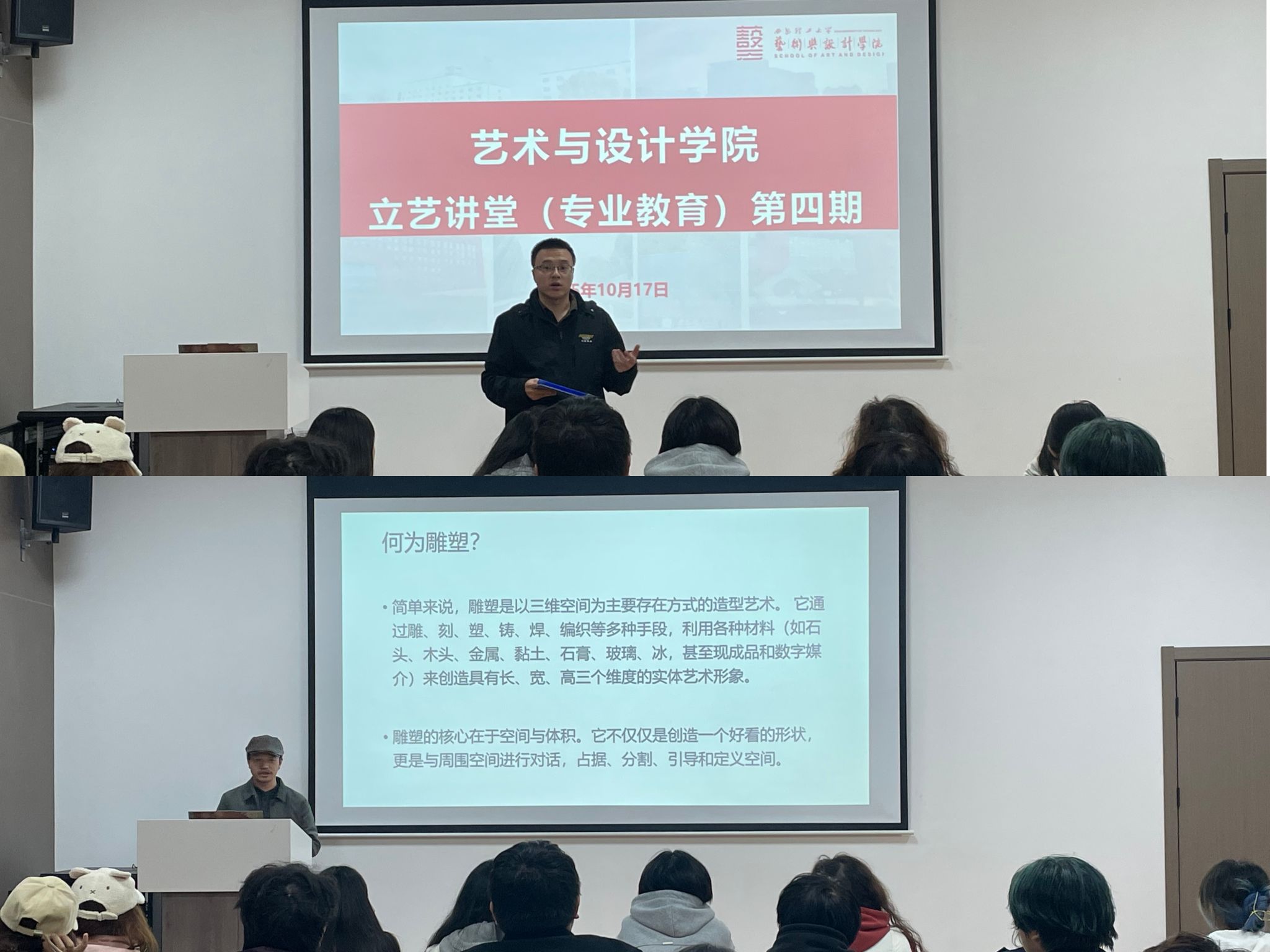 为帮助2025级新生筑牢专业基础、明晰发展方向、增强专业认同,伟德bevictor中文版于2025年10月17日中午,在曲江校区就业发布大厅面向全体美术学专业新生举办了第四期“立艺讲堂”专业教育活动。本期讲座特邀雕塑专业负责人宋明明副教授、摄影专业负责人罗斌,担任主讲。