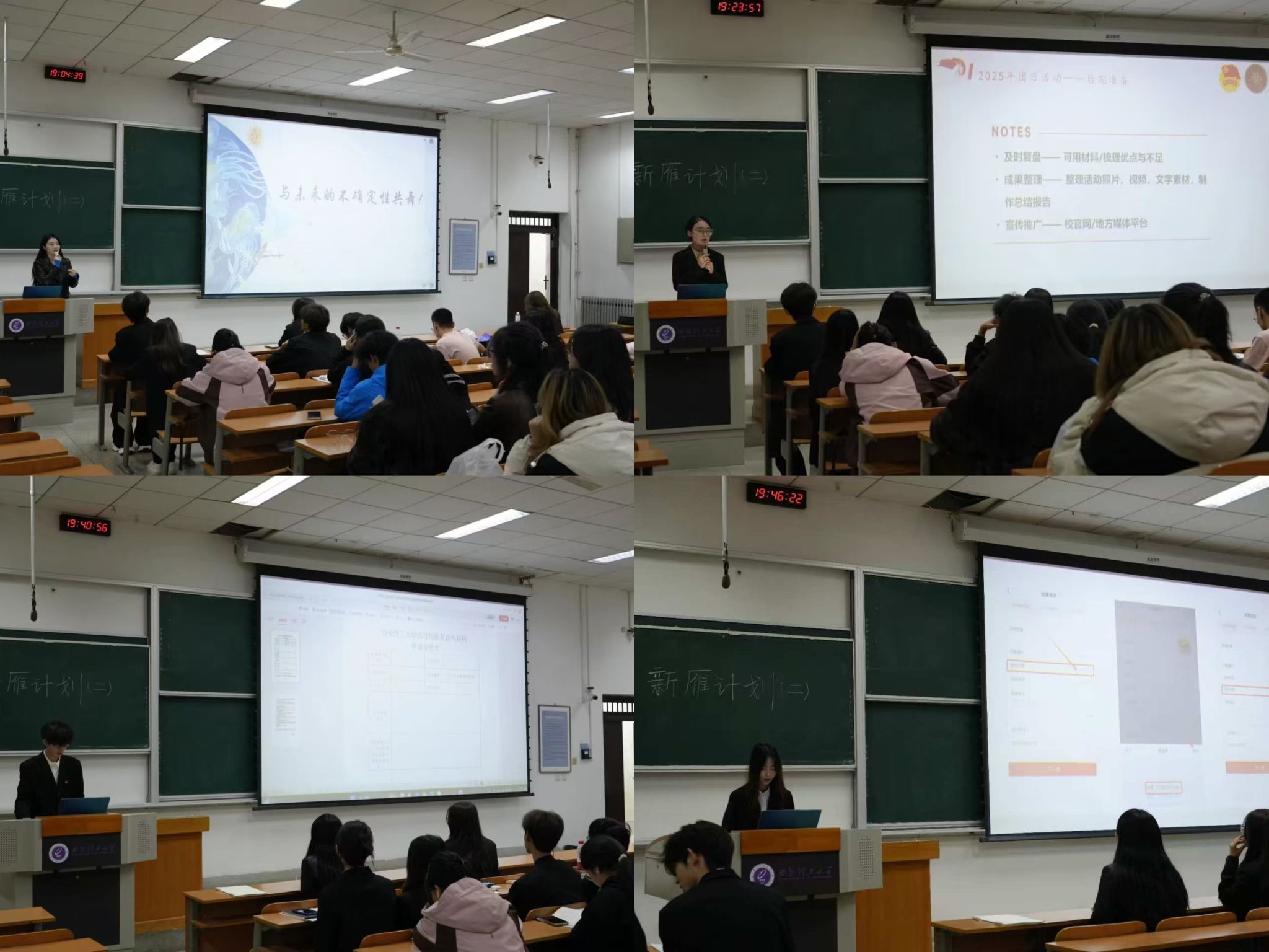 院组织部负责人高镱铭结合优秀案例,从框架搭建、逻辑梳理、PPT设计及现场应变等方面分享主题团日活动经验;俞长春系统介绍校内场地功能、申请流程、审批时限及使用规范,明确预约要求;张晶聚焦“PU平台申请实操”提供细致指导;最后,赵婷在总结中讲到,期望学员将所学内化于心、外化于行,严格落实团务规范,以“高标准、严要求”提升工作质量,为学院共青团事业注入青春动能。
